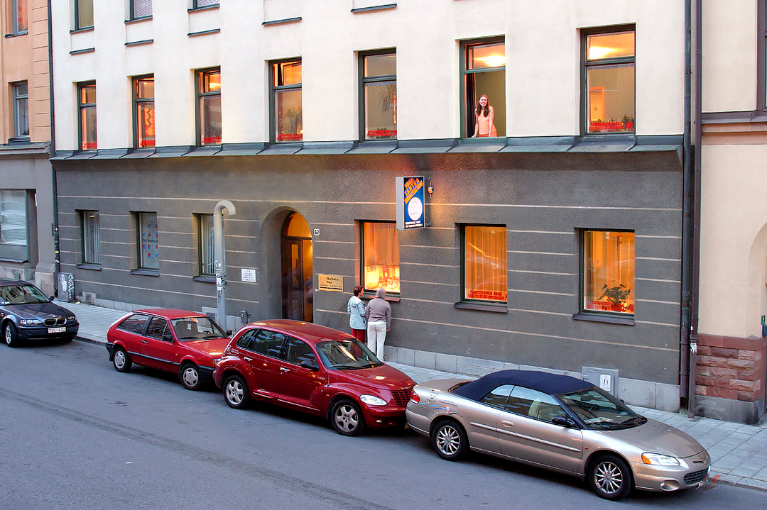 Skolan i Stockholm i två våningar på Västmannagatan 62 med Mira, skolans ledare, i fönstret.