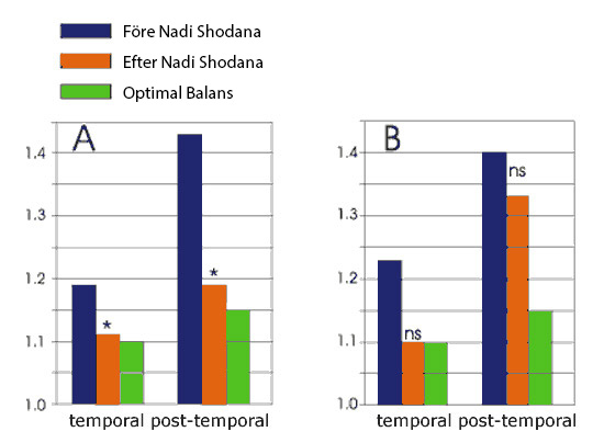 A. Fem personer i den tränade gruppen, som från början hade ett H/V-förhållande under 1,00, hade efter Nadi Shodana värden över 1,00. Omvänt fick fem personer, som före övningen hade ett högt H/V-förhållande, efter övningen lägre värden. Alla personer i denna grupp närmade sig det bästa möjliga förhållandet mellan hjärnhalvorna. Efter Nadi Shodana hamnade alla i den tränade gruppen mycket nära det genomsnittliga värdet, d v s att det är statistiskt signifikant.