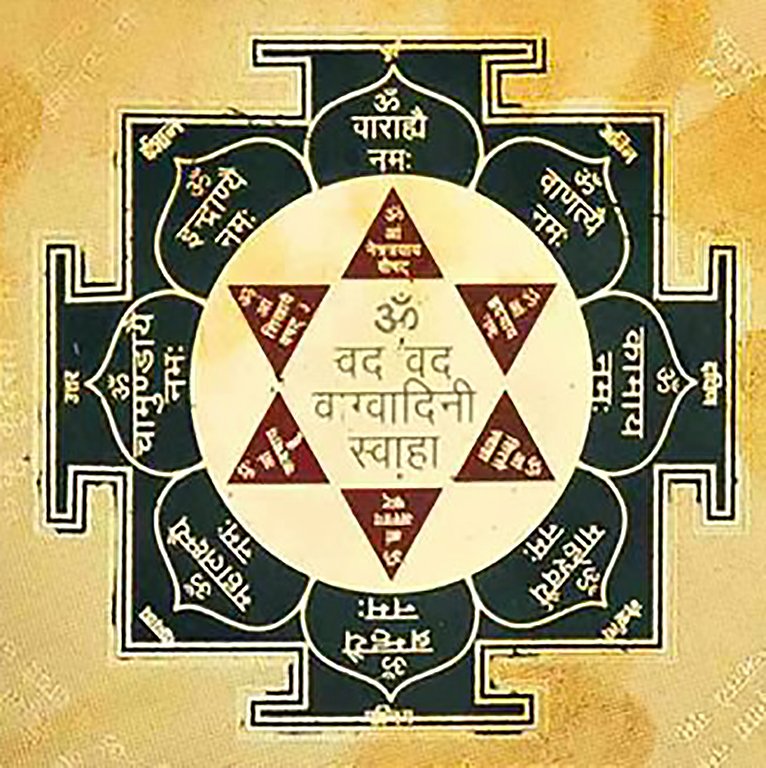 Ett Saraswati yantra med mantrat OM VAD VAD Vagvadini Swaha; den som giver visdom, vetande och vältalighet.