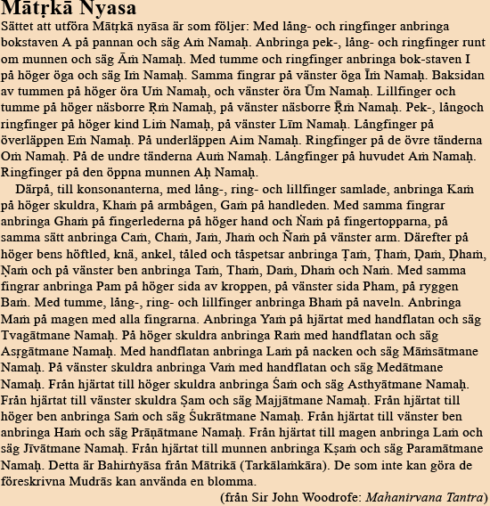 Sanskritalfabetet sägs, liksom runorna på sin tid i Norden, inte bara tjäna som bokstäver i bildandet av ord, utan även att bokstäverna var för sig har en inneboende kraft, en vibration som bildar grundlaget till vetenskapen om mantra. I en form av nyasa fördelas sanskritalfabetets bokstäver över hela kroppen, detta kallas matrika nyasa: