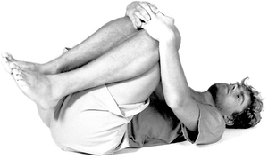 Ligg på rygg på en yogamadrass. Böj båda benen och knäpp händerna kring dem. Gunga lugnt från sida till sida. Du ska inte rulla helt ned på sidan, bara så långt att du fortfarande känner att korsryggen är i kontakt med underlaget. Känn hur ryggen masseras. Fortsätt på detta sätt i någon minut. Ligg sedan stilla ett ögonblick med böjda ben.