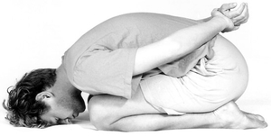 Sitt på underbenen. Tag fatt kring höger handled bakom ryggen. Böj långsamt överkroppen framåt tills huvudet vidrör golvet. Kommer huvudet inte helt ned mot golvet så sära på knäna lite. Ligg helt stilla. Låt inte tankarna fara iväg utan var i kroppen och känn den.