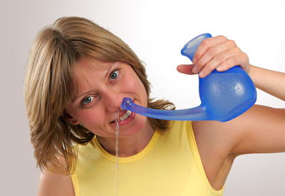 Böj huvud och överkropp framåt. Vrid huvudet en aning åt sidan och låt kannan följa med uppåt. Nu rinner vattnet av sig själv in genom ena näsborren och ut genom den andra. Smuts och slem sköljs med ut.